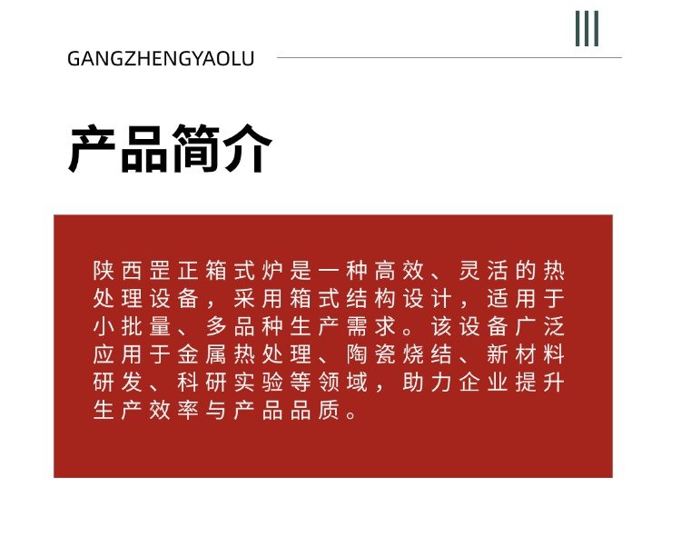 陜西罡正箱式爐是一種高效、靈活的熱處理設備,采用箱式結構設計,適用于小批量、多品種生產需求。該設備廣泛應用于金屬熱處理、陶瓷燒結、新材料研發、科研實驗等領域,助力企業提升生產效率與產品品質。