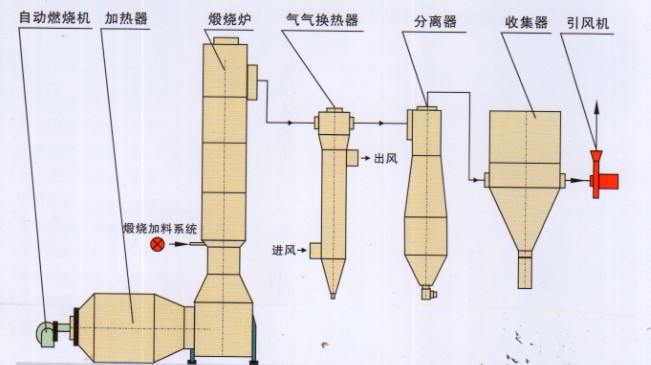 通常采用系統引風裝置,系統處于負壓狀態;用直接或間接方式獲得熱介質,煅燒尾氣采用冷卻,旋風分離,袋式過游器進行空氣凈化和產品回收。