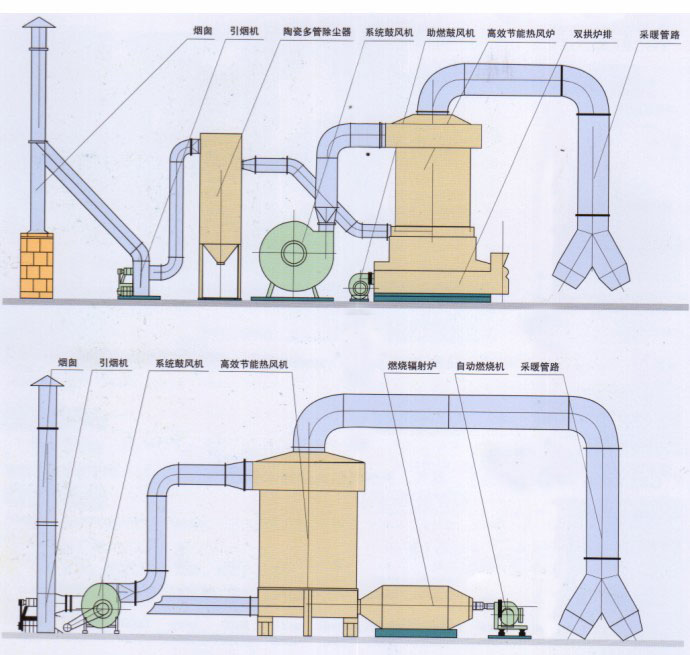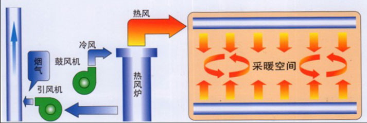 由鼓風機將潔凈空氣送入熱風爐,經過換熱由管道輸入各采暖空間。