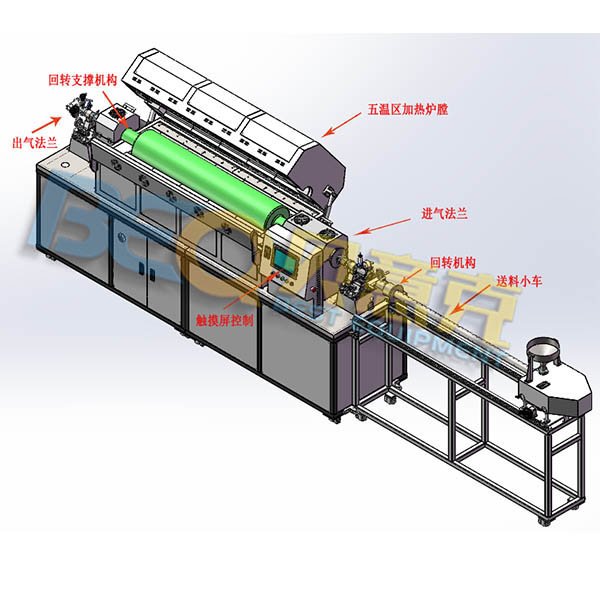 二、設備組成:加熱系統,爐管轉動系統,螺旋送料系統、供氣系統、真空系統、工控及操作系統。