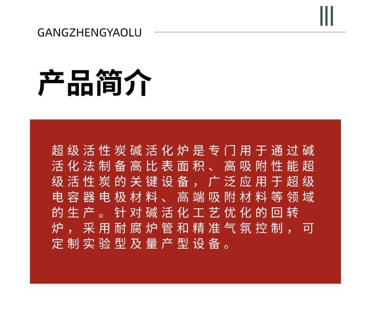 陜西罡正窯爐科技有限公司的GZ-LX 超級活性炭堿活化爐是一款專為高性能活性炭生產設計的核心設備,尤其適用于超級電容活性炭、鋰電負極材料前驅體等高端應用場景。