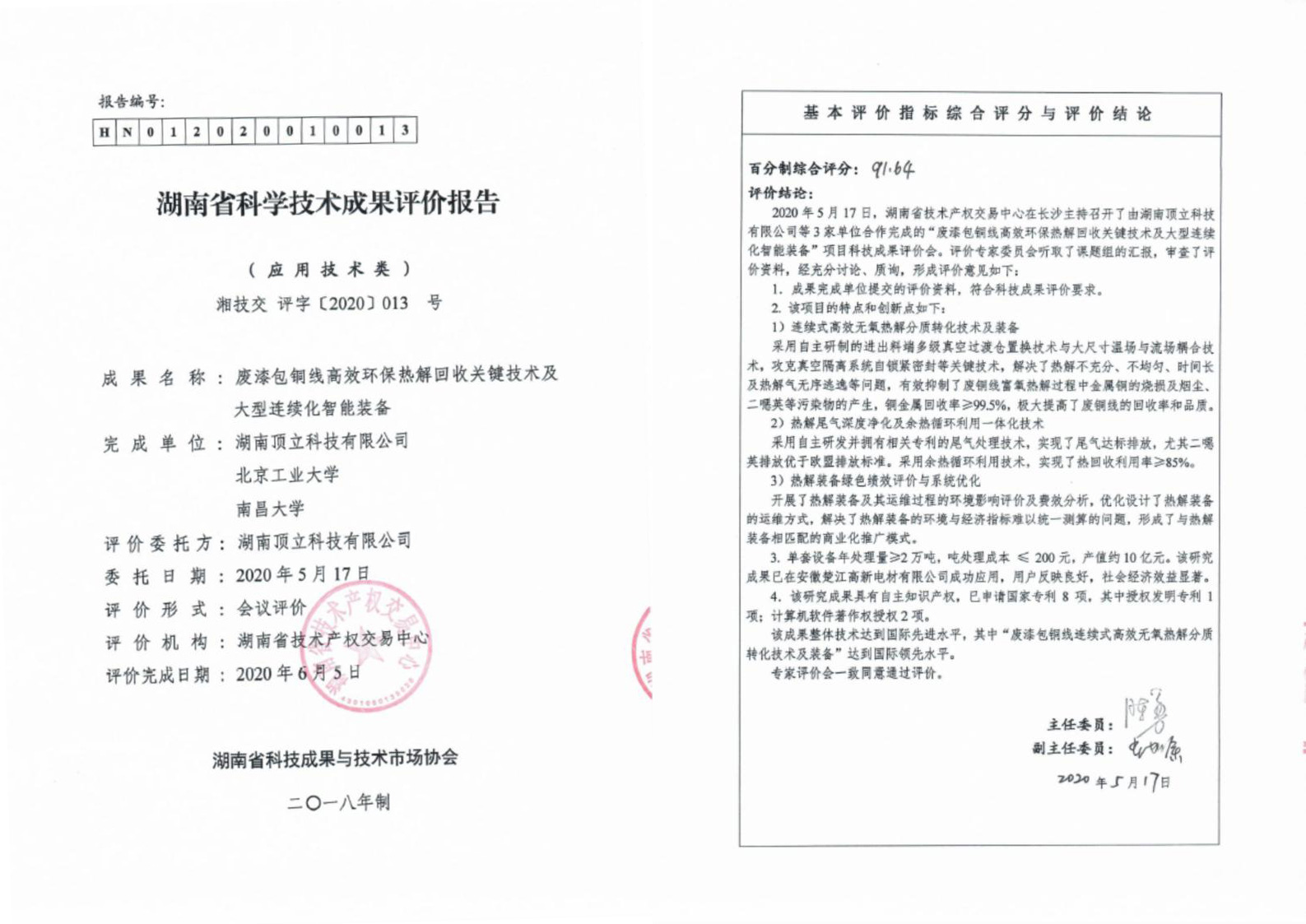 2020年,經(jīng)由中科院廣州能源所陳勇院士為主任委員等十位專家評價(jià)認(rèn)定:“廢漆包銅線高效環(huán)保熱解回收關(guān)鍵技術(shù)及大型連續(xù)化智能裝備”整體技術(shù)達(dá)到國際**水平,部分達(dá)到國際**。