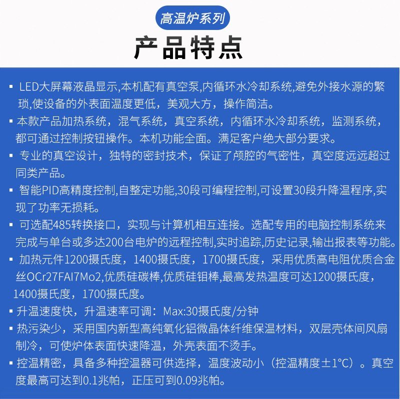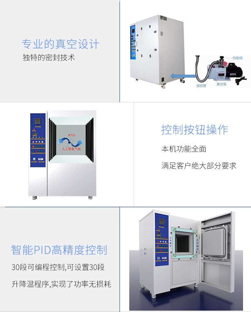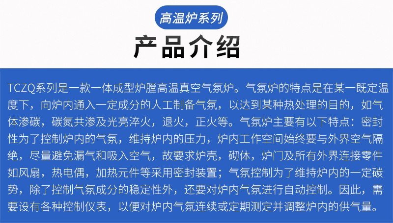 TCZQ系列是一款一體成型爐膛高溫真空氣氛爐。氣氛爐的特點是在某一既定溫度下,向爐內通入一定成分的人工制備氣氛,以達到某種熱處理的目的,如氣體滲碳,碳氮共滲及光亮淬火,退火,正火等。氣氛爐主要有以下特點:密封性為了控制爐內的氣氛,維持爐內的壓力,爐內工作空間始終要與外界空氣隔絕,盡量避免漏氣和吸入空氣,故要求爐殼,砌體,爐門及所有外界連接零件如風扇,熱電偶,加熱元件等采用密封裝置;氣氛控制為了維持爐內的一定碳勢,除了控制氣氛成分的穩定性外,還要對爐內氣氛進行自動控制。因此,需要設有各種控制儀表,以便對爐內氣氛連續或定期測定并調整爐內的供氣量。