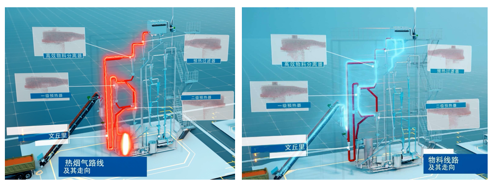 生產(chǎn)物料由輸送機(jī)送入到原料倉中,并由螺旋給料機(jī)將物料送入文丘里,與高溫?zé)煔獬浞只旌希M(jìn)入高效物料分離器中分離后,物料與二級預(yù)熱器出口的熱煙氣進(jìn)行混合干燥,然后物料進(jìn)入到一級預(yù)熱器中,分離的物料與焙燒分離器出口處的熱煙氣充分混合干燥,再進(jìn)入到二級預(yù)熱器中,完成物料干燥過程。