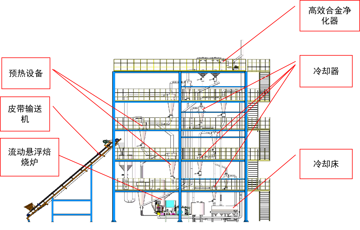 來自高效合金凈化器和預(yù)熱過濾器捕集下的物料經(jīng)過管路輸送,與二級物料預(yù)熱器預(yù)熱后的物料一起進(jìn)入到流動懸浮焙燒爐中進(jìn)行高溫焙燒。焙燒完成后的物料隨熱氣流進(jìn)入焙燒分離器中,生產(chǎn)物料在焙燒分離器中得到分離。