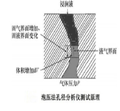 ◆ 液液驅(qū)替法: 將待測濾材采用與其完全浸潤的浸潤液浸潤后,采用與該浸潤液不相溶的液體作為驅(qū)替液,將浸潤液驅(qū)替出通孔 孔道,可通過液體流量、壓力數(shù)據(jù),根據(jù) Washburn 公式,獲得該濾材的孔徑數(shù)據(jù)。由于液液的界面張力遠(yuǎn)小于氣液界面張力, 所以,相比氣液驅(qū)替法(泡壓法),液液驅(qū)替法可以測試更小孔徑的濾材。 ◆ 孔徑和壓力的關(guān)系如Washburn公式:D=4γCosθ/p 公式中:D=孔隙直徑;γ=液體的表面張力 ;θ=接觸角;p=壓差 ◆ 孔徑分布的流量百分比: f(D) = - d[Fw/Fd)x100]/dD 公式中:Fw=濕樣品流量;Fd=干樣品流量 |