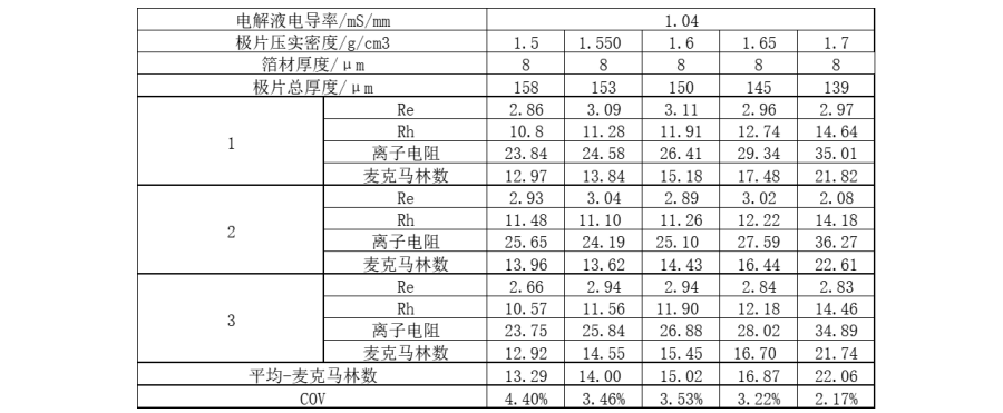 結論:隨著壓實密度的增大,負極極片的麥克馬林數增大,說明迂曲度變大;從COV上可以看到,測試的極片COV均小于5%,說明測試一致性較好。
