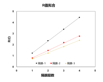 將隔膜組裝成不同層數的樣品,電極采用不銹鋼做電極,隨后測試EIS變化,得到不同層數的隔膜電阻,計算隔膜離子電導率。