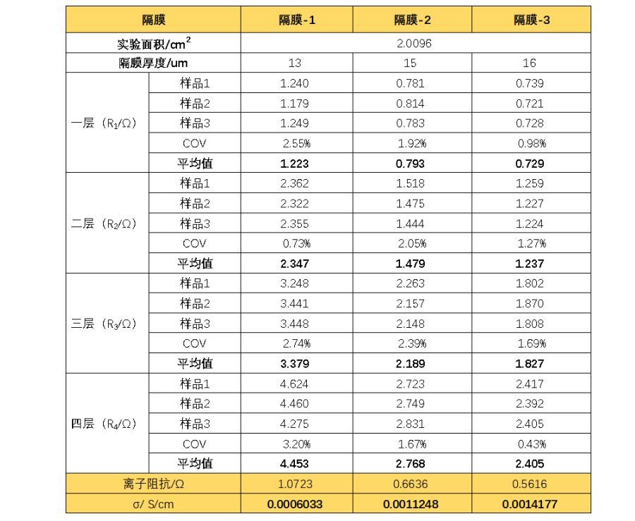 其中,R為測試離子電阻,A為有效反應面積, σ為離子電導率, d為隔膜厚度。