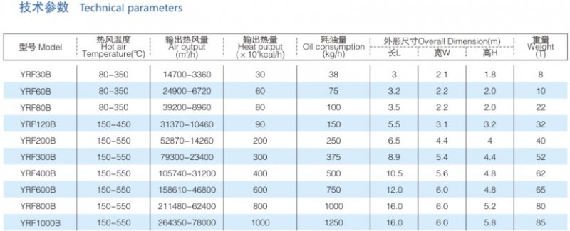 YRF-B換熱式燃油(氣)熱風爐:供熱量80萬千卡/小時以下的爐型,換熱室和燃燒室合為一體,材質為耐火磚和20g,供風溫度350℃以下;供熱量在100-1000萬千卡/小時的爐型,換熱器和燃燒室為分體結構,換熱器材質問20g,供風溫度350℃以下,換熱器材304,供應溫度550℃,換熱器材310S,供風溫度750℃以下。YRF-B換熱式燃油(氣)熱風爐熱效率>80%,排放達標。