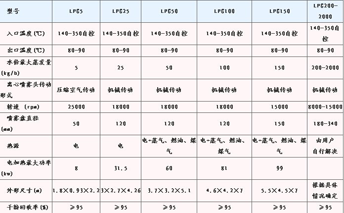 注:水份蒸發量與物料及熱風出口溫度有關。另可根據客戶要求制作各種非標規格的噴霧干燥機