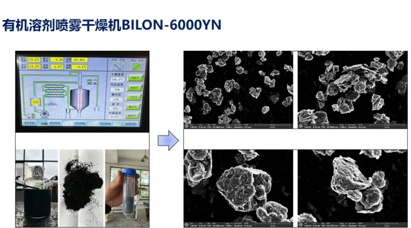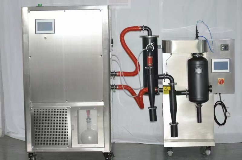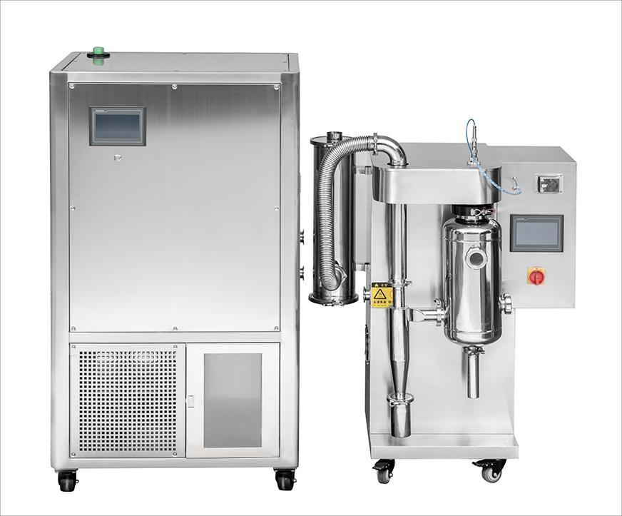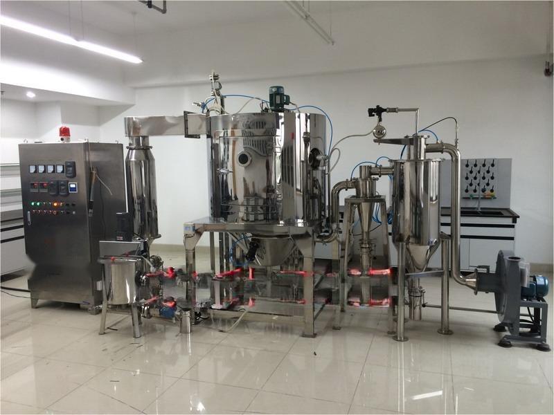 閉路循環噴霧干燥系統采用惰性氣體作為循環氣體,對干燥的物料具有保護作用,循環氣體經歷載濕、去濕的過程,介質可重復使用;氮氣經加熱器加熱后進入干燥塔,液體物料經螺桿泵輸送至離心噴頭處,液體被高速循環的霧化器霧化成液滴,在干燥塔內完成熱質交換過程,被干燥后的粉狀物料從塔底排出,被蒸發的有機溶劑氣體在風機負壓的壓力下,把夾在氣體中的粉塵經旋風分離器、噴淋塔除塵后飽和的有機溶劑氣體經冷凝器冷凝成液體排出冷凝器,不凝性氣體介質連續加熱后作為干燥載體在系統內重新循環使用。