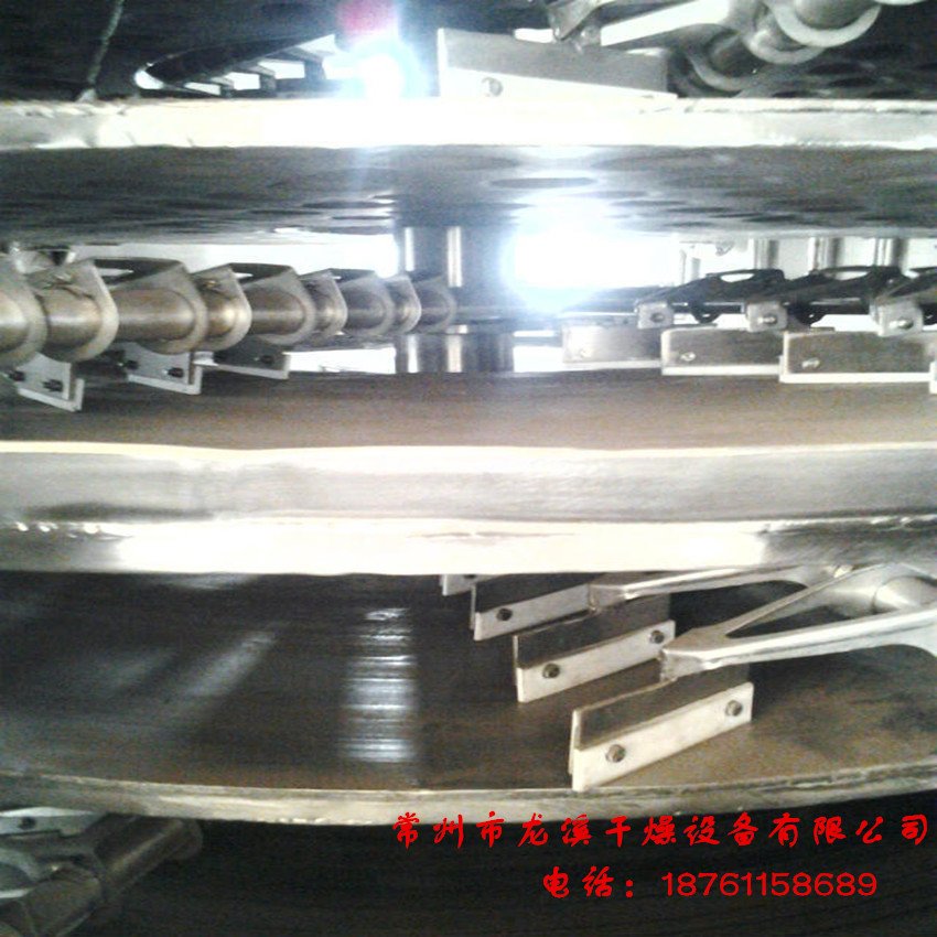 濕物料自加料器連續(xù)地加到干燥器上部**層干燥盤上,帶有耙葉的耙臂作回轉(zhuǎn)運動,使耙臂連續(xù)地翻抄物料。物料沿指數(shù)螺旋線流過干燥盤表面,在小干燥盤上的物料被移送到外緣,在大干盤上的物料向里移動并從中間落料口落入下一層小干燥盤中。大小干燥盤上下交替排列,物料得以連續(xù)地流過整個干燥器。中空的干燥盤內(nèi)通入加熱介質(zhì),加熱介質(zhì)形式有飽和蒸汽、熱水和導(dǎo)熱油,加熱介質(zhì)由干燥盤的一端進(jìn)入,從另一端導(dǎo)出。已干物料從*后一層干燥盤落到殼體的底層,*后被耙葉移送到出料口排出。濕汽從物料逸出,由設(shè)在頂蓋上的排濕口排出,真空型盤式干燥器的濕汽由設(shè)在頂蓋上的真空泵口抽出。從底層排出的干物料可直接包裝。通過配加翅片加熱器、溶劑回收冷凝器、袋式除塵器、干料返混機構(gòu)、引風(fēng)機等輔機,可提高其干燥的生產(chǎn)能力,干燥膏糊狀和熱敏性物料,可方便地回收溶劑,并能進(jìn)行熱解和反應(yīng)操作。