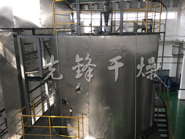 ??空氣經(jīng)過濾和加熱,進(jìn)入干燥器頂部空氣分配器,熱空氣呈螺旋狀均勻地進(jìn)入干燥室。料液經(jīng)塔體頂部的高速離心霧化器,(旋轉(zhuǎn))噴霧成極細(xì)微的霧狀液珠,與熱空氣并流接觸在極短的時間內(nèi)可干燥為成品。成品連續(xù)地由干燥塔底部和旋風(fēng)分離器中輸出,廢氣由風(fēng)機(jī)排空。