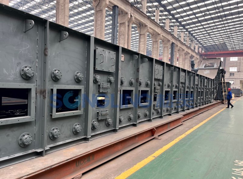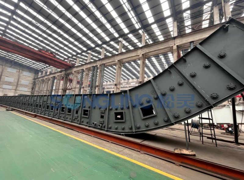 干渣機與鍋爐底部為全密封結構,底渣由爐膛通過渣井、液壓關斷門,落到排渣機的輸送鱗板上。整套干式排渣機分為上下兩層,由頭部變頻電機驅動,以鏈條帶動鱗板完成輸送過程,同時設有自動清掃裝置及張緊裝置。