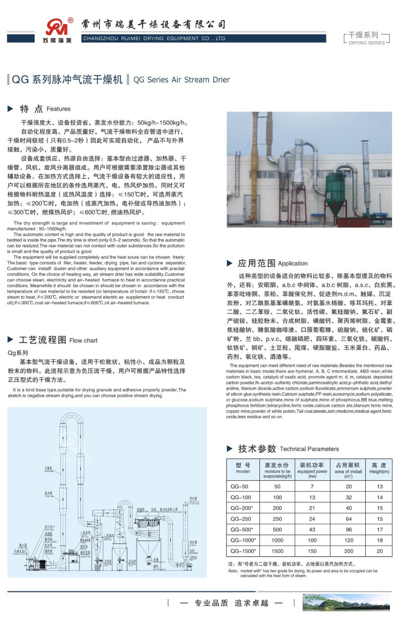 產品概述 QG系列脈沖式氣流干燥機是大批量的干燥設備,它采用瞬間干燥的原理,利用載熱空氣的快速運動,帶動濕物料,使濕物料懸浮在熱空氣中,這樣強化了整個干燥過程,提高了傳熱傳質的速率,經過氣流干燥的物料,非結合水分幾乎可以全部除去(例如:淀粉等物料進料含水量≤40%左右,成品出料可為13.5%), 并且所干燥的物料,不會產生變質現象,產量可比一般干燥機干燥有顯著提高,用戶可在短期內取得較高的經濟效益。應用范圍 本公司生產制造QG氣流干燥設備,引進美國先進技術設備,經過獨特的設計,已達國際**,本產品整個設備自動化程度高,投資少,耗能低,占用人力和廠房面積比較少,通用面廣,是理想的現代化設備。產品特點 QG氣流干燥機,適用于制藥、化工、食品、建材、塑料等行業的粉狀物料的干燥除濕,例如:淀粉、魚粉、食鹽、酒糟、飼料、面筋、塑料樹脂、礦粉、煤粉、糖氯酸、A·S·C笨甲酸、2·3·酸,聚氯乙酸聚丙稀、硫酸鈉、焦亞硫酸鈉等多種物料的干燥。 我公司就氣流干燥設備對外咨詢,并代為設計制造非定型氣流干燥機。