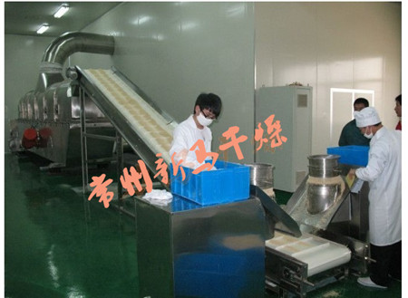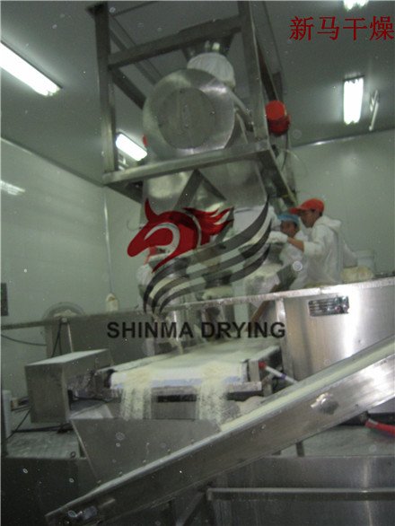 2、該生產線的核心部分:干燥系統。采用分段加熱的方式,預干燥段采用高壓低風量風機,使較濕的雞精顆粒能完全流化;干燥段采用低壓高風量的風機,單位時間內帶走水份多,干燥均勻;冷卻段采用高風量風機,能迅速帶走熱量,降低產品溫度,既達到水分控制的要求,又方便后續包裝工藝。