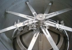 ??為了能將待干物料連續、均勻、定量地輸送入干燥主機進行干燥作業,在濕料斗內靠近螺旋的部位設置了破拱的攪拌裝置,速度和螺旋轉速相同。同時,針對電池材料濾餅具有粘性的特點,輸送螺旋設計成雙螺旋結構,螺旋片相互錯開設置,且互相切入。這樣就很容易互相破壞粘性物料“抱軸”現象,雙螺旋具有自清理功能,并使用變頻器調整轉速。