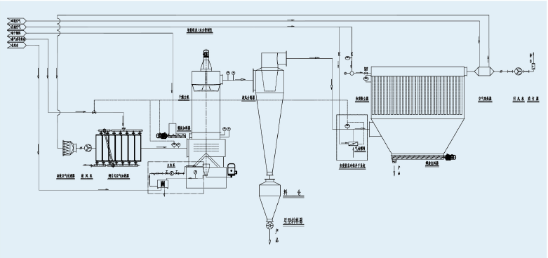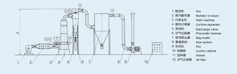 鼓風機→空氣加熱器→閃蒸干燥主機→旋風分離器→布袋除塵器→引風機