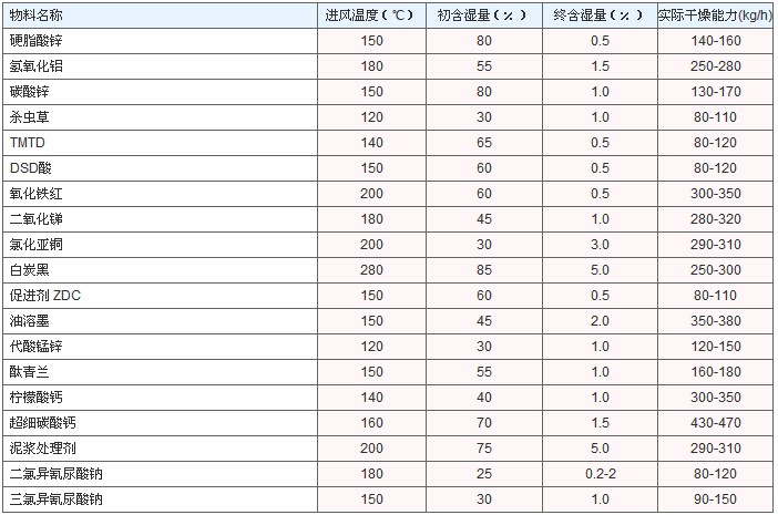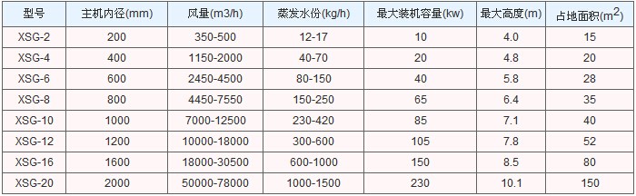 注:1.水份蒸發(fā)量是以進(jìn)風(fēng)溫度為180℃,出風(fēng)溫度為80℃時(shí)每小時(shí)蒸發(fā)的水份。