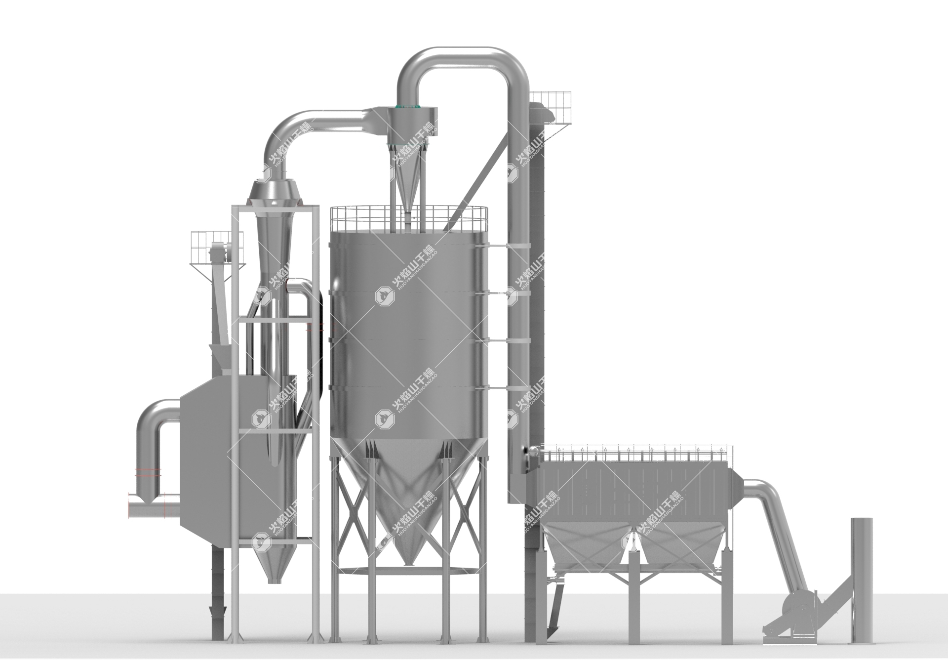 含水分的物料在筒體內被熱氣流帶動,在從底部被吹到頂部的過程中與熱氣流實現熱交換,使水分得到蒸發。其主要特點是順流、懸浮、立式。