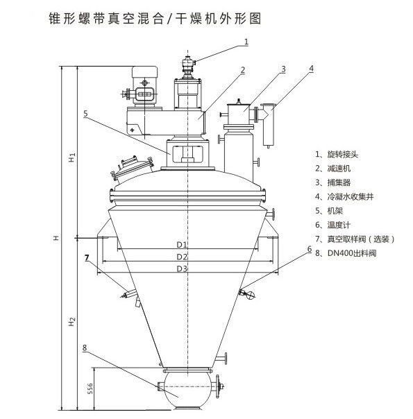??錐形螺帶混合/干燥機(jī)裝填率為有效工作容積的30%—100%,在此范圍內(nèi)不同裝料量的混合和干燥都可以得到一致的結(jié)果。