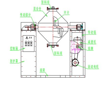 雙錐混合機由轉桶、設備支架、動力部分組成。
