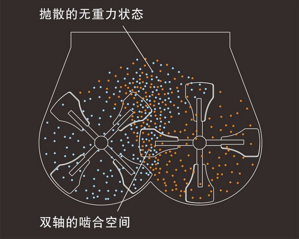 無重力混合機裝載著兩根同時異向向外旋轉(zhuǎn)的平行槳葉軸,每根軸上搭載十字槳葉,在驅(qū)動裝置的同步作用下,兩根的十字槳葉軸的運行軌跡成相交關(guān)系,且錯位嚙合。驅(qū)動裝置驅(qū)使槳葉軸快速旋轉(zhuǎn),旋轉(zhuǎn)的槳葉產(chǎn)生離心力,將物料有效拋灑至筒內(nèi)上空部分,達到拋物線的**點后下落(拋物線的**點也稱為瞬間無重力狀態(tài)),物料再受槳葉的驅(qū)趕,在筒體內(nèi)往復循環(huán)混合,并受雙軸的嚙合空間混合、剪切、分離,致使物料快速混合均勻。
