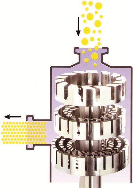 三級高剪切均質機,主要用于微乳液及超細懸浮液的生產。由于工作腔體內三組分散頭(定子+轉子)同時工作,乳液經過高剪切后,液滴更細膩,粒徑分布更窄,因而生成的混合液穩定性更好。三組分散頭均易于更換,適合不同的工藝應用。該系列中不同的型號的機器都有相同的線速度和剪切率,非常易于擴大生產。適宜的溫度,壓力與粘度參數與DISPGRSING一樣。也符合CIP/SIP清潔標準,適合食品及醫藥生產。
