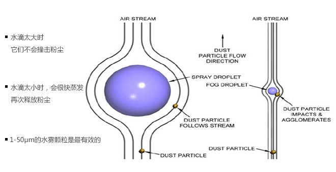 根據粉塵聚合理論和空氣動力學理論,粉塵顆粒一般直徑在0.1um-75um,當粉塵顆粒與比它體積大得多的水滴相遇時,會被水滴旁邊的空氣流(流速更快)帶動前進而不與水滴相碰。而與粉塵顆粒大小相接近的霧滴,表面張力小,易于和粉塵結合,使微霧顆粒與粉塵顆粒相互碰撞、粘結、聚合增大,并在自身重力作用下沉降,達到抑塵目的。 POTA會根據粉塵粒徑特性,選擇合適的噴頭(高壓單流或氣水混合雙流),產生對應粒徑的霧滴,改變水的表面張力,大大增強霧滴捕捉粉塵的能力。