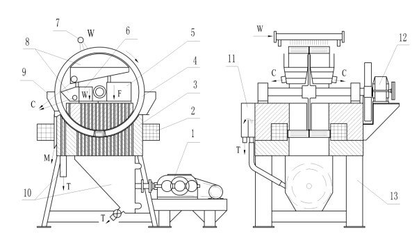 11.液位斗 12.轉環驅動機構 13.機架 F-給礦 W-清水 C-磁性產品 M-中礦 T-非磁性產品
