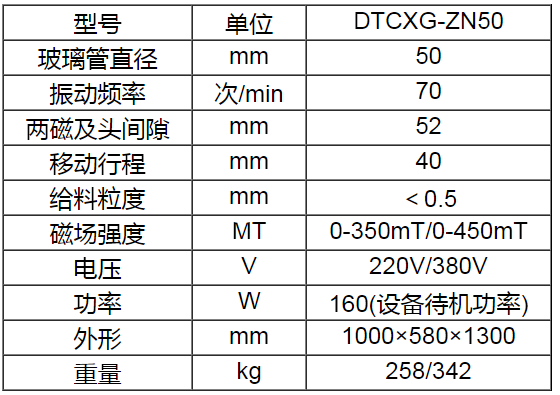 DTCXG-ZN50智能型磁選管是在傳統(tǒng)國標型磁選管的基楚上的改進產(chǎn)品,在測量原理及使用方法步驟等方面完全嚴格的按照國家標準執(zhí)行。其間對設備的整體結(jié)構(gòu)及操作控制部分進行了創(chuàng)新升級。設備整體采用了新型車式結(jié)構(gòu)設計,外形美觀大方,移動靈活,使用方便。核心控制器采用計算機控制技術(shù),全智能操控,可在測量時對磁場強度進行一鍵式全自動測量,并對磁場強度進行全數(shù)字化直接顯示,操作簡單,顯示直觀。磁場輸出采用激磁控制模塊,磁場強度無級線性調(diào)節(jié),測量準確、運行可靠。為了保證測量的準確性,每一臺磁選管均在出廠前做了磁場強度的標定,完全符合《選煤用磁鐵礦粉實驗方法》(GB/T18711-2002)對實驗設備的要求。是原CXG型磁選管的換代產(chǎn)品。