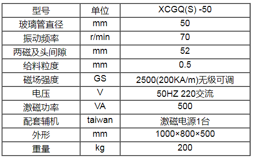 XCGQ(S)-50型磁選管是在C型電磁鐵的兩極端之間,裝有玻璃管作往復移動和擺動,被分選的試料在通過磁場區時,磁性部分即附在管壁附近,非磁性部分在機械運動中被水沖刷而排出。