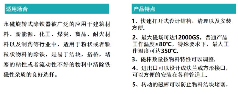 永磁旋轉式除鐵器被廣泛的應用于建筑材料、新能源、化工、煤炭、食品、耐火材料以及制藥等行業中,適用于粉狀或者顆粒狀物料的除鐵,是易于結塊,搭橋,堵塞的粘性或者流動性不好的物料中清除鐵磁性雜質的良好選擇。