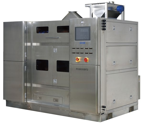 佐竹公司結合多年的色選經驗和技術,結合塑料粒子的特點和行業要求,開發出塑料粒子色選機,塑料粒子經過振動喂料器的振動,將物料均勻分布到傳動的傳送帶上,塑料粒子在離開傳送帶時,高分辨率的相機對每一個粒子進行檢查,從相機內傳輸的信號經過放大器放大和處理來識別出帶有黑點的粒子或異色的粒子,后續的噴射閥收到信號后吹出不良品。