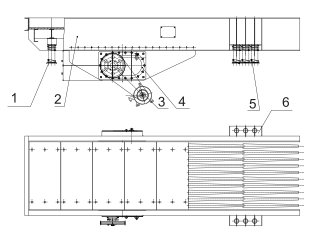 1.后彈簧支架 2.機架 3.電機 4.振動器 5.彈簧 6.前彈簧支架