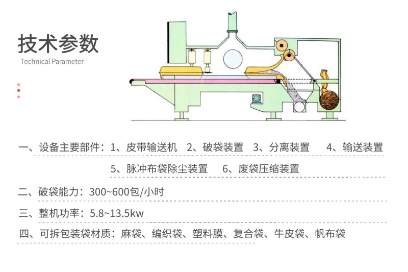 注:自動拆包機因物料性質、使用場合、出料方式等變化,其整套設備的配置、產量、材質、功率等有所變化。